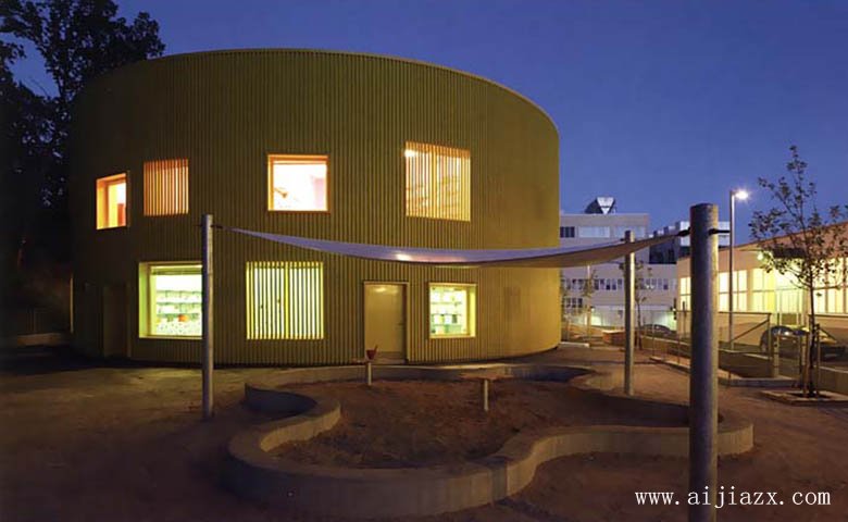 从商场的后面看,整体就只有一个弧面的结构,整体都呈现出简约的格调,只有一点简单的建筑外构型,少量的绿植装饰,打造出低调的建筑后半部分,方便整个商场的后勤操作。简单的格子窗户,搭配温馨舒适的杏黄色给人以舒适的视觉感受。