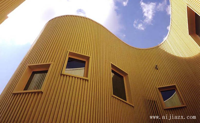在内侧面观看商场外观,整体以木质外包,搭配上实木线条构造出格栅式纹样,增加空间的层次感,加上内侧面整体曲面的造型,以及错落有致的简单方框窗户,提升建筑的观赏性。完全延续外部的色调,以杏黄色构造一体式的颜色,扩大建筑给人的视觉感官。